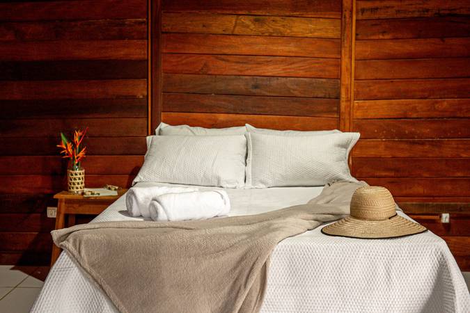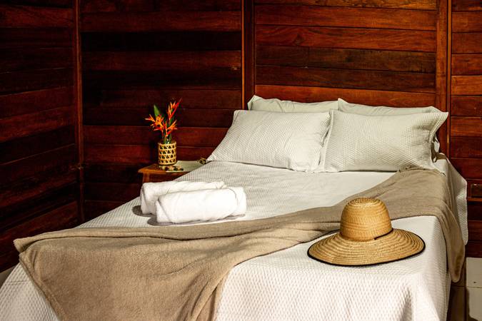 Chalé para duas pessoas, com uma cama de casal e banheiro privativo. A varanda com rede oferece um espaço perfeito para relaxar e aproveitar a vista da floresta. Um refúgio acolhedor e exclusivo no coração da Amazônia.