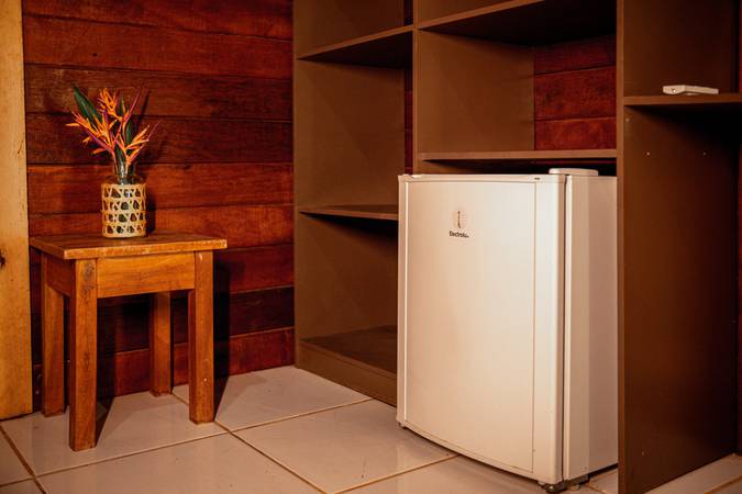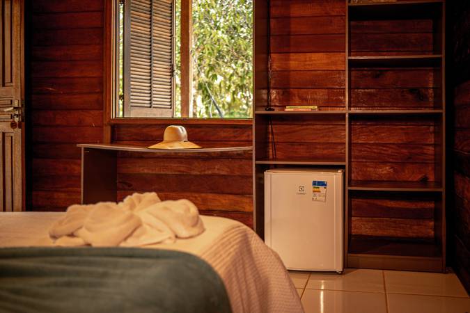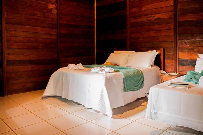 Possui banheiro privativo, varanda com rede e vista para a imensidão da floresta, proporcionando descanso e conexão com a natureza.